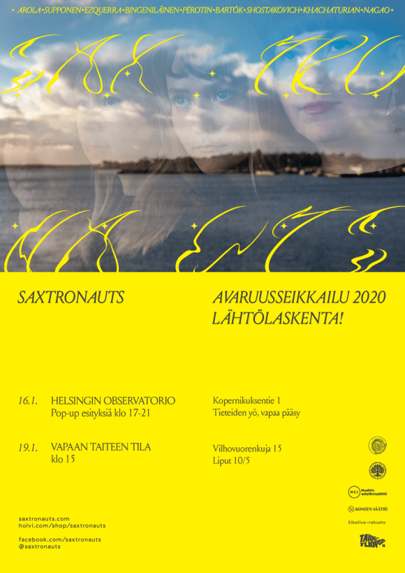 Kokoontuminen tähtitornin pääovien edessä, jossa ilmoittautuminen. Tähtitornissa voi liikkua vapaasti musiikkiesitysten aikana. Huom! Saxtronauts-yhtye siirtyy esittämään yhden kappaleen myös Vartiovuoren vesisäiliön galleriaan, jossa on esillä nykytaidenäyttely Enemmän kuin silmäni näkevät. Kestot ovat arvioita.